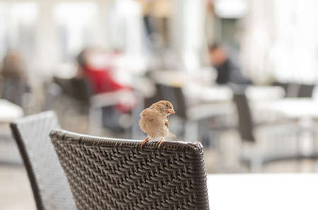 Female sparrow on the back of a chair in a cafeteria in the center of Pamplona. Her gaze is towards the camera. Out of focus background. Lifestyle of birds in cities.