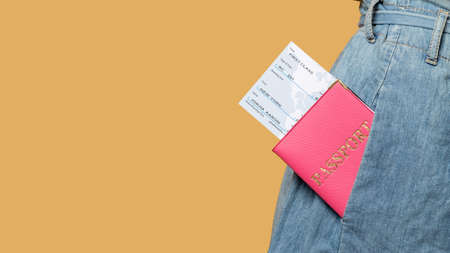 Holiday vacation. Travel agency. Summer journey. Visa office. Foreign passport with tickets in jeans pocket unrecognizable woman isolated on beige copy space.