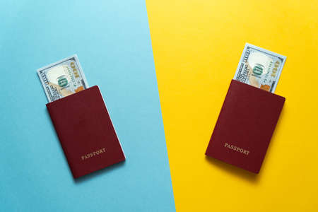 Passports with banknotes of 100 dollars on a blue and yellow background. The concept of equality between men and women. Everyone pays for themselves during their holidays