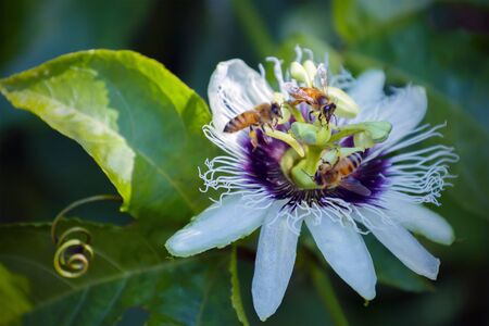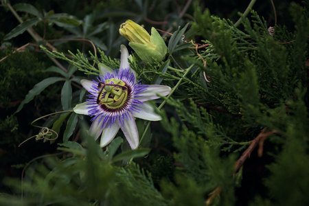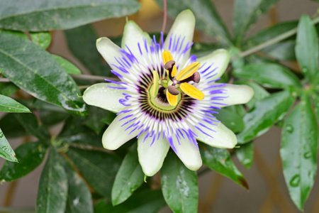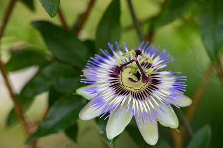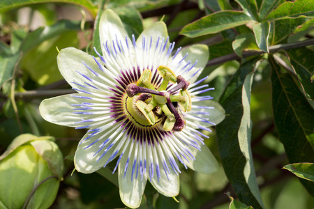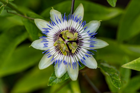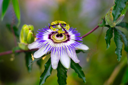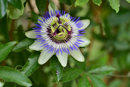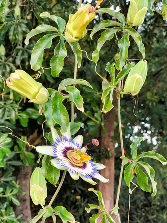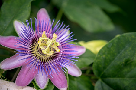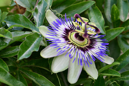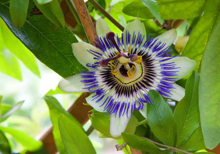A closeup shot of the exotic Flower of Passion among the fresh leaves