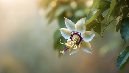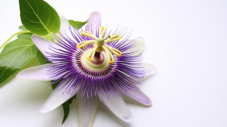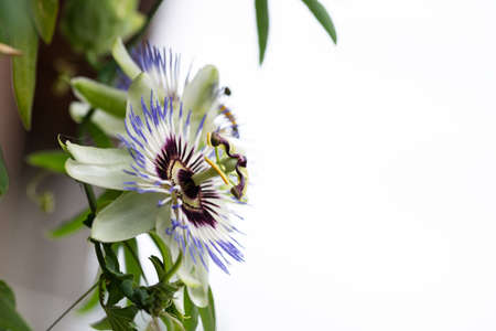 Single passiflora or passionflower with green foliage and copy space