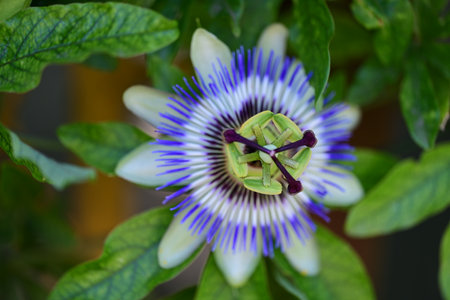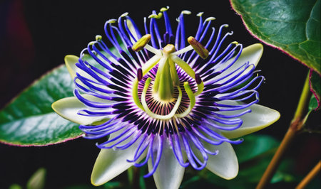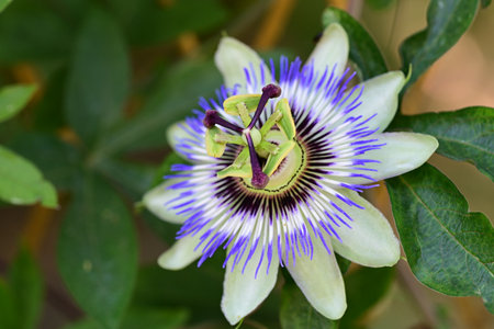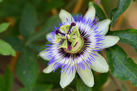 Close-up of a beautiful passiflora incarnata showing its vibrant purple and blue colors with green leaves in the background