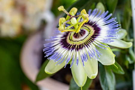 Close-up of exotic purple passion flower Passiflora caerulea blossom with green blurred background