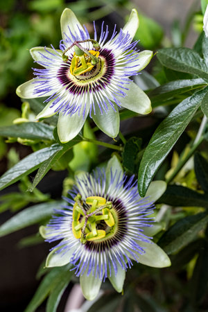 Passiflora blue plant, flowers close-up, decorative landscaping