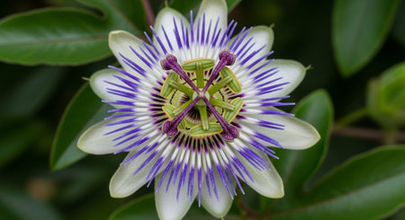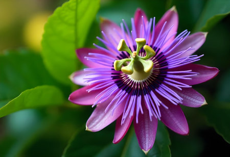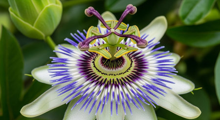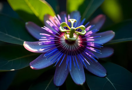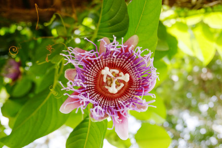 Close-up of Exotic Passion Flower in Bloom. Vibrant Nature Macro. A stunning passion flower in full bloom, showcasing intricate details, vivid colors, and lush green foliage in natural sunlight.