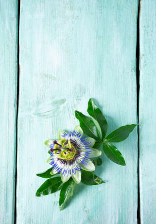 passion flowers on turquoise wooden surface
