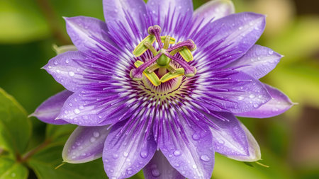 Purple Passiflora flower with water drops on petals