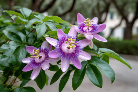 Passion flowers displaying vibrant purple petals and intricate coronas among green foliage