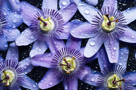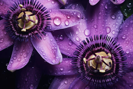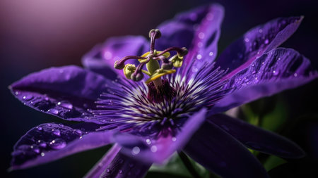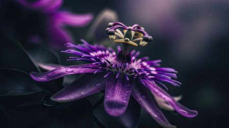 This close-up image showcases a striking purple passion flower, its petals detailed against a dark background. Water droplets glisten on the flower, enhancing the visual appeal. The style leans towards a macro view, with soft lighting accentuating textures. Suitable for illustrating nature, beauty, or botanical themes in various commercial applications.