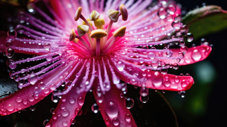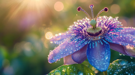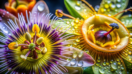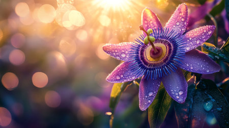 Close-up of a passionflower with intricate details and dew drops sparkling in the morning sun, exotic garden setting generative ai