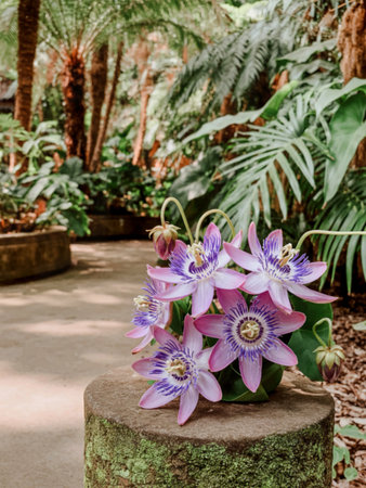 Purple passion flowers on stone in tropical garden