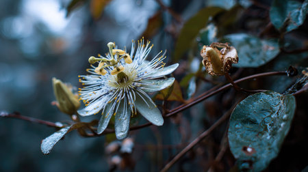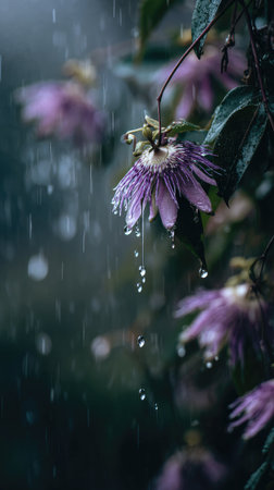 Soft rain falling gently on Passionflower, with water droplets forming and slowly dripping. The background is softly blurred with natural, moody atmosphere.