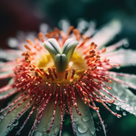 A close up of a flower with water droplets. Generative AI image.