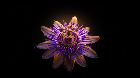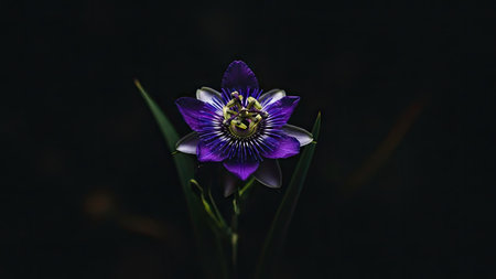 A striking passion flower is centered against a dark backdrop. The flower displays intricate details with shades of purple and yellow. The composition employs overhead lighting to emphasize the texture and form of the petals. The image may be suitable for botanical illustrations and artistic uses.