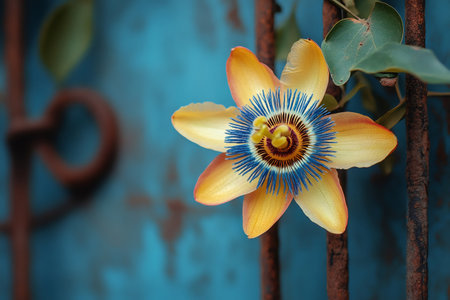 Close up of a colorful passion flower growing on a rusty metal gate against a vibrant turquoise background