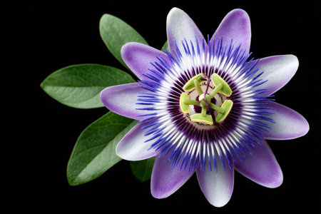 Close up of a vibrant purple passion flower with green leaves, isolated on a black background, showcasing its intricate details and delicate beauty