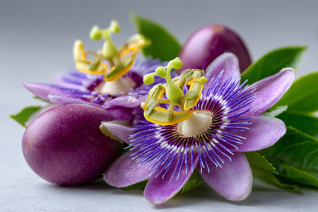 Passiflora flowers and purple passion fruits arranged against a gray background