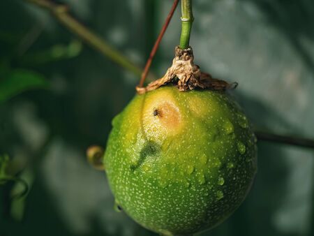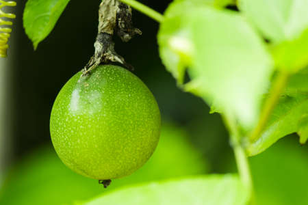 Green passion fruit on the farm close up image
