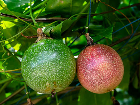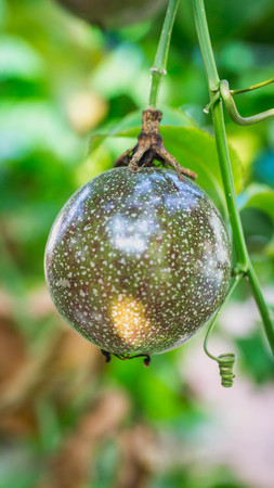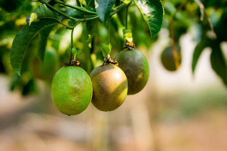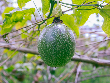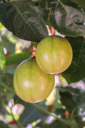 Raw Passiflora edulis fruit hanging in the tree