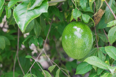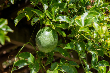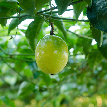 A green unripe Maracuya fruit (Passiflora edulis) hanging on a tree branch under the sunlight