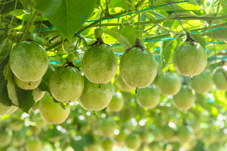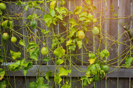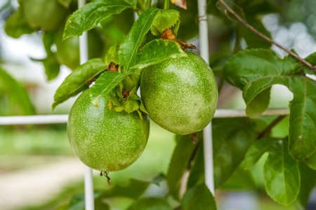 Grren Passion fruits hanging on vines with green leaves in home garden blurred nature background, tropical fruit in organic farm and sustainable environment concepts.