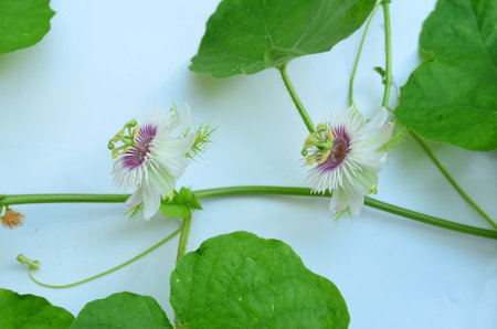 Flowers and leaves of Passionflower (Passifloraceae) on a branch