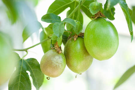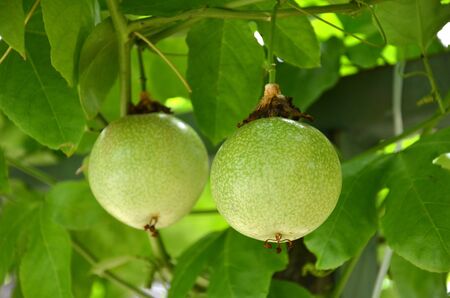 Green fruits of passion fruit. There are more than 530 species of passion fruit, however, Passiflora edulis is best known. It is a fruit rich in minerals and vitamins, mainly A and C.