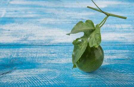 Green also fresh fruit inedible. Place the timber on a background of blue and white. Passion Fruit Focus.