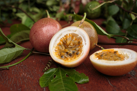 Passion fruit on wood table with green leaves