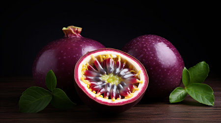 sliced ??fresh passionfruit on a wooden table