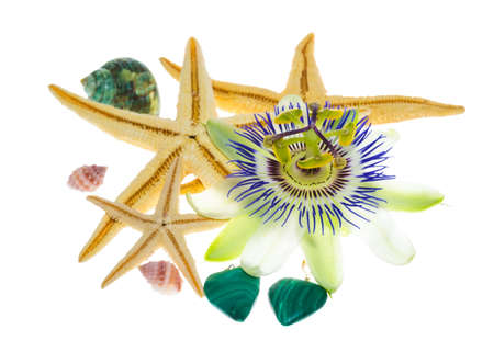 tropical still life, the starfish, cockleshells, passionflower are isolated on the white