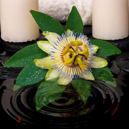 spa setting of passiflora flower, green leaf with drop, towels and candles on zen stones in ripple reflection water, closeup