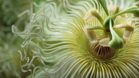 Detailed portrait of Passiflora incarnata with curling tendrils and star-like floral symmetry under soft light