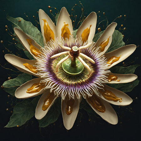 Close-up of a passionflower with intricate details and dew drops sparkling in the morning sun, exotic garden setting generative ai
