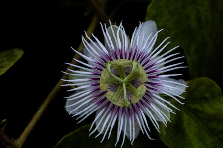 Flower of the Passion. (Passiflora sp.) Flower among green leaves.