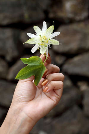 Hand holding beautiful passion fruit flower