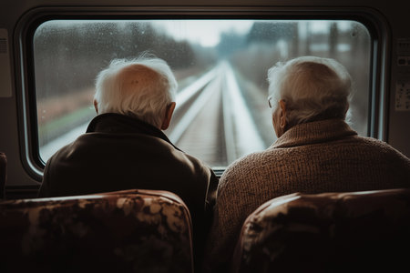 Two elderly individuals sit close together on a train, looking out the window as they travel through a scenic, rainy landscape, sharing a quiet moment.