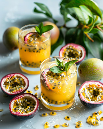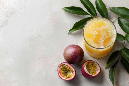 A glass of homemade passion fruit juice sits on a light table, surrounded by fresh fruits and green leaves, showcasing a vibrant and refreshing beverage perfect for summer enjoyment.
