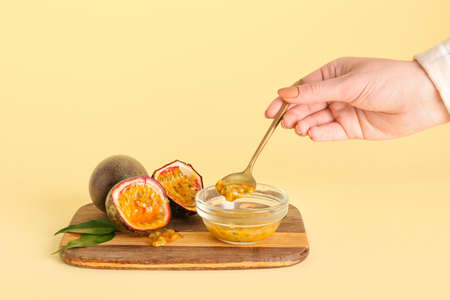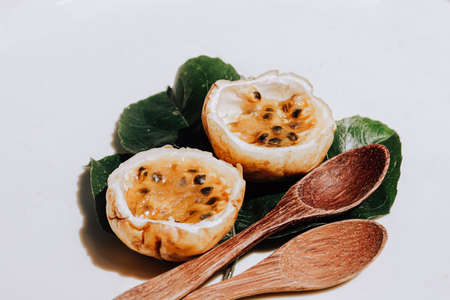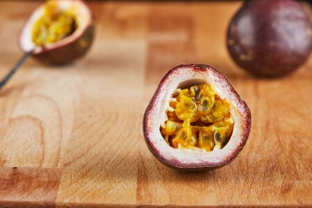 Close up of wooden spoon and fresh yellow passion fruit sliced in half