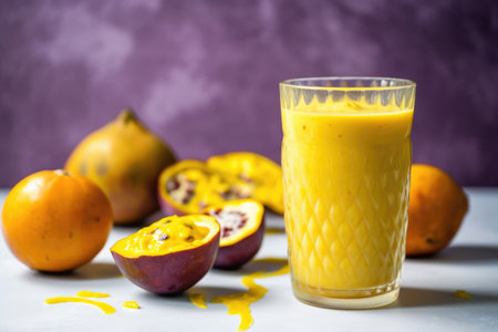 a passionfruit smoothie with fresh passionfruit next to it, created with generative ai