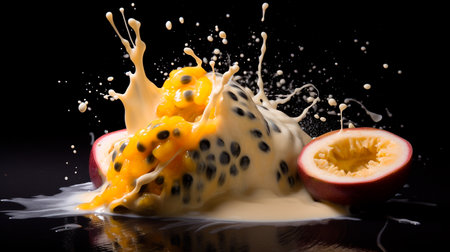 Passion fruits spill open, releasing juice and creating a dynamic splash against a dark backdrop.