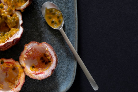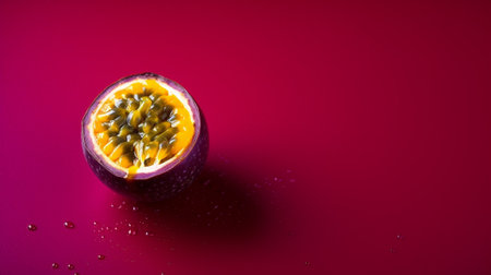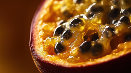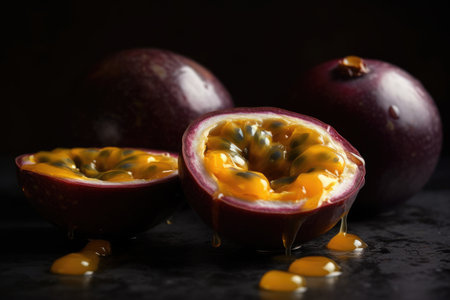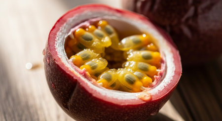 Juicy passion fruit cut in half reveals vibrant pulp and seeds, showing its delicious interior and rich texture