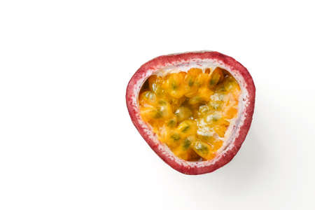 Granadilla or passion fruit, cut open with pulp on white background