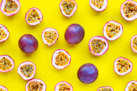 Fresh passion fruit on yellow background, Tropical fruit in summer season, Flat lay with copy space