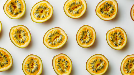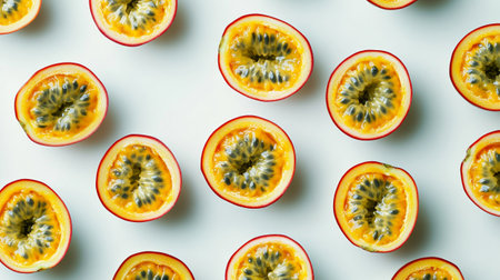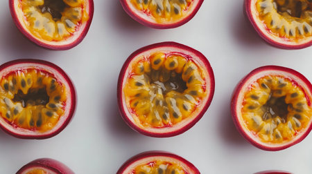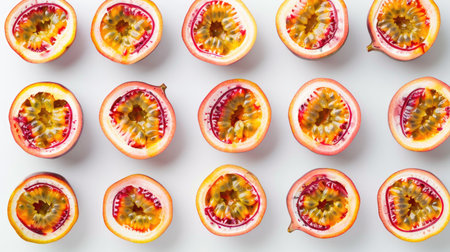 Whole and sliced passion fruits arranged neatly, showcasing their juicy interiors, on a white background