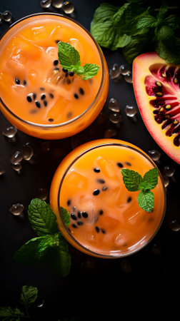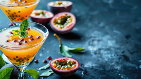 Tropical passion fruit cocktails garnished with mint and seeds on dark textured surface