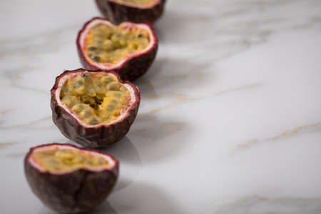 Ripe passion fruits line up in row on marble background