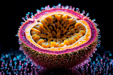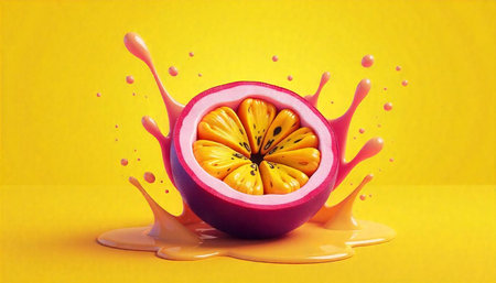 Fresh passion fruit half with splashing juice vibrant background