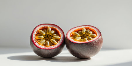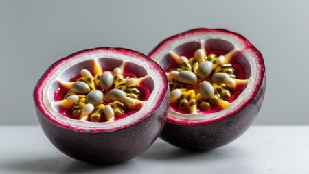 AI Generated. Ripe Passion Fruit Halves Showcasing Seeds and Vibrant Colors