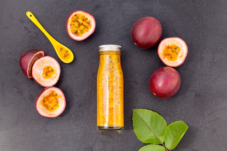 Fresh passion fruit and juice in the bottle for healthy and refresh.